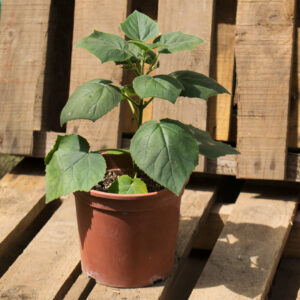 Tenemos plantas de alrededor de 30 cm con grandes hojas. Ojo que crecen muy pero muy rápido. Ahora los vendemos en macetas de 2 lt para más seguridad.